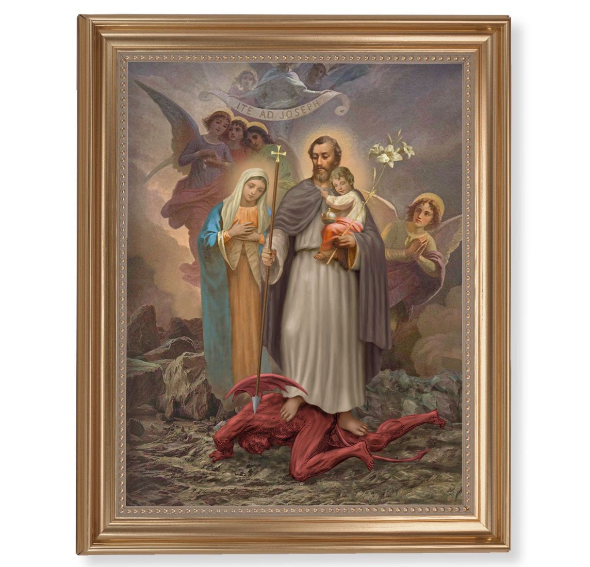 . Joseph Terror of Demons. March 19 May 1 Patronage. This gold framed art features St.